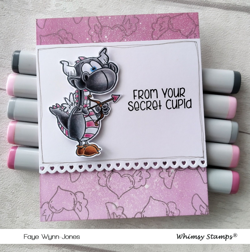 You know I love Dustin's Dragons, so I couldn't help but colour another Dudley from the Dudley's Valentine Set, part of the latest mini release at Whimsy Stamps. I also used another of the stamps from the same set to create the background. Sorted!
